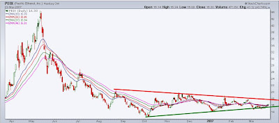 Finally bottomed-out on heavy volume in the fall around 14.50, and has been forming a base over the past six months. Moved up to the mid 18's and just recently made what might be a double bottom as it touched the 14's again...Could move up again from here if and when the market psychology toward this medical device maker begin to shift...