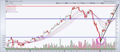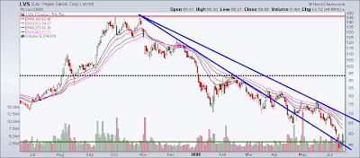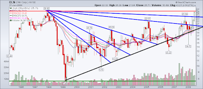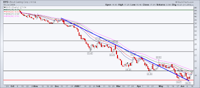 ED, increased steadily from its May 2004 low, around $32 a share, while staying in a nice Uptrend that held support a number of times at the BLUE uptrend support line... Made a clear year-long DOUBLE TOP around $49 a share throughout 2007 and then proceeded to crash through uptrend support... Rebounded off that down move only yo be rebuffed by the SINGER MOVING AVERAGE BAND which provided staunch resistance...Needs to hold the $39 level...